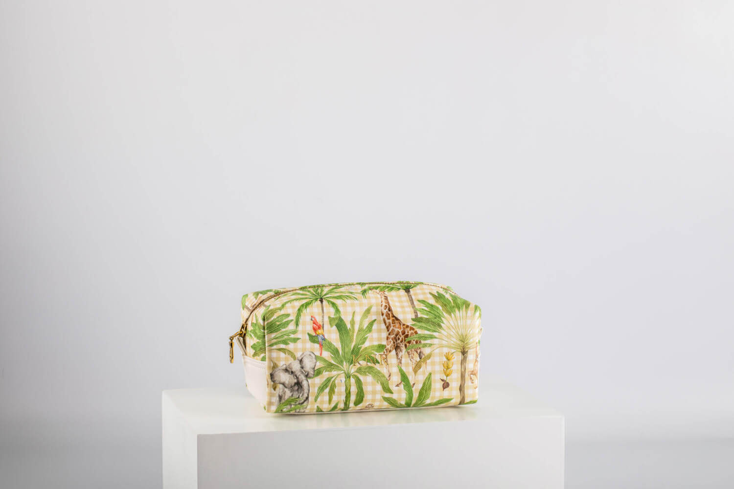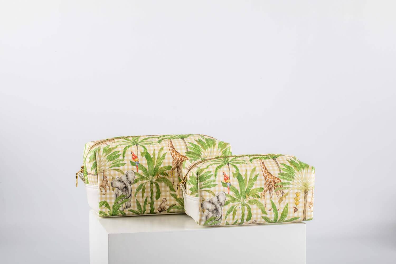Keep your travel essentials neatly organized with this set of two rectangular safari-themed pouches.