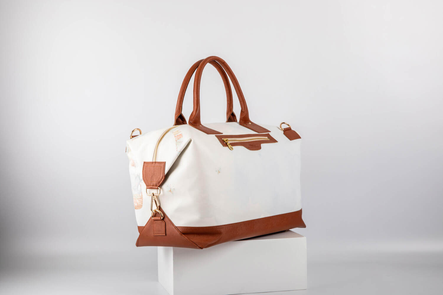 Travel in style with this adorable duffle bag featuring cute animals soaring through the sky in hot air balloons. Perfect for weekend getaways, this bag combines whimsy with practicality.