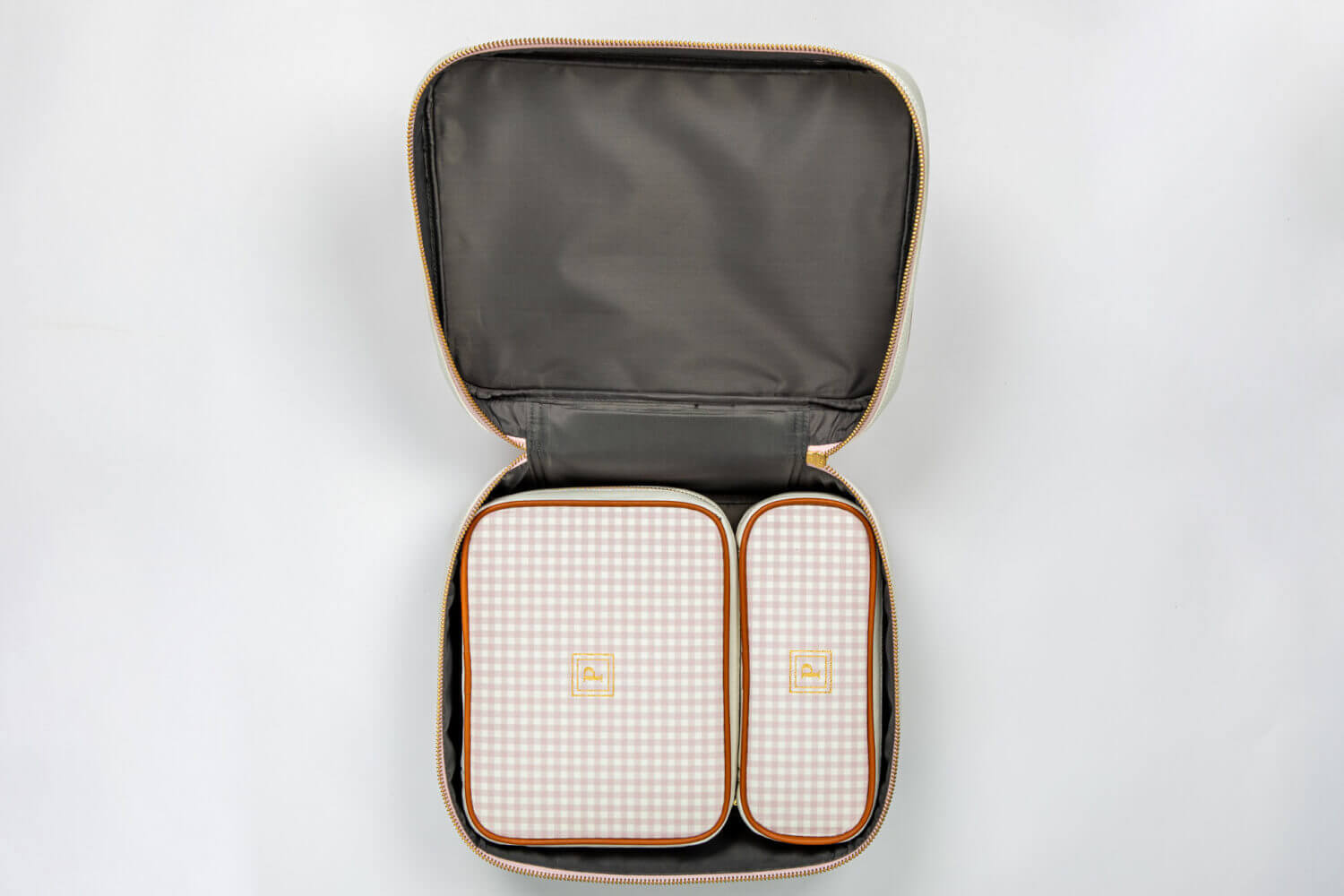 This set of pouches is thoughtfully designed for women who are always on-the-go. Arrange your scarf, woolens and lingerie in the big pouch, makeup and medicines in the medium one, sanitary pads, jewelry and smaller items in the square pouch, and toiletries in the elongated one. Customize the monogram on your signature set, free of cost.